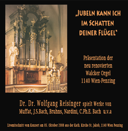 ![]() | Klangbeispiel ... Programm G. Muffat Toccata secunda (1653-1706) J.S. Bach Fantasie über „Komm heil’ger Geist, Herre Gott“ BWV 651 (1685-1750) Choralvorspiel „Schmücke dich, o liebe Seele“ BWV 654 Präludium & Fuge f-moll BWV 534 N. Bruhns Präludium & Fuge e-moll (1665-1697) P. Nardini Adagio für Orgel (1722-1793) C. Ph. E. Bach Sonate für Orgel in F-Dur Wq 70,3 (1714-1788) 1. Allegro A.F. Kropfreiter Toccata francese (1936-2003) W. Reisinger Improvisation 1 (*1964) S. Karg-Elert Marche triomphale über „Nun danket alle Gott“ op. 65/59 (1877-1933) W. Reisinger Improvisation 2 (*1964) Organist DDr. Wolfgang Reisinger wurde am 25.12.1964 in Wien geboren. Nach dem Studium der Kirchenmusik und dem Orgel-Konzertfach bei Prof. Alfred Mitterhofer an der Wiener Musikhochschule (heute Universität für Musik und darstellende Kunst) bekleidete er ab dem Jahr 1987 eine Position als Domorganist in Schweden, danach wurde in das oberösterreichische Stift St. Florian berufen, wo er als Stiftsorganist an der Brucknerorgel wirkte. Im Jahr 1990 kehrte er nach Wien zurück, wo er seitdem als Kirchenmusikreferent für das Vikariat Wien-Stadt und als Lehrer am Diözesankonservatorium für Kirchenmusik der Erzdiözese Wien tätig ist. Zu seiner umfangreichen Konzerttätigkeit als Organist (v.a. Mitteleuropa, Skandinavien und die USA) und Chor- bzw. Ensembleleiter treten vor allem seine Kompositionen für die Liturgie sowie sein großer Einsatz in der kirchenmusikalischen Basisarbeit, wie etwa die alljährlich während der Semesterferien im niederösterreichischen St. Pölten stattfindende Kirchenmusikwoche Laudate Dominum und unzählige Improvisations- und Kantorenkurse. Des Weiteren war DDr. Wolfgang Reisinger in den Jahren 2004 und 2006 als Gastprofessor für Orgel an der Universität für Musik und darstellende Kunst in Wien tätig. Am 19.6.2008 erhielt er für seine Dissertation über das Thema "Stileinflüsse auf das Orgelwerk von Maurice Duruflé" seinen bislang zweiten Doktortitel verliehen. |
