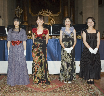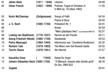 Handglocken Handglocken, auch Englische Handglocken genannt, wurden vor ca. 400 Jahren in England nach dem Vorbild der Kirchenglocken geschaffen (kreiert). Handglocken-Sets werden chromatisch gestimmt und können aus bis zu 9 Oktaven bestehen. Sie werden in der Reihe von tieferen zu höheren Tonlagen aufgestellt - so wie die weißen und schwarzen Tasten eines Klaviers. Die Musik der Handglocken ist durch ihren hoch resonanten und einzigartig anziehenden Klang charakterisiert, der durch die Obertöne zustande kommt. Erfreuen Sie sich an der wunderbaren Musik und dem zarten Glockenklang des 8-Hände (4-Spieler/innen) bestehenden Handglockenensembles "Mai", das mit großer Handfertigkeit 37 Glocken zum Erklingen bringt.  | Klangbeispiele zu 02 César Franck zu 12 Teiichi Okano zu 13 Kazuhiko Onoe Programm  Beschreibung zum Gebet für Orgel (1987) - Kazuhiko Onoe (*1942) Das Stück "Gebet I" wurde für das Hiroshima-Gedenkkonzert für Frieden komponiert. Es wurde 1987 von Kaoru HIYAMA in Hiroshima und 26 Europäischen Städten (u. a. auch in Mödling / St. Othmar) und 1988 in den USA und Kanada aufgeführt. Es drückt eine Drohung und Warnung vor den Sünden jener Menschen aus, die die Atombombe entwickelten und einsetzten. Das wichtigste Motiv sind die Rufe des Vogels, der in die Morgenröte einer neuen Menschheitsgeschichte fliegt. Sie senden uns immer wieder eine Warnung durch diese Musik. "Gebet I" besteht aus zwei Sätzen. Der erste Satz hinterfragt durch die Schreie des Vogels die Sünden der Menschen und die Explosion der Atombombe. Die 5-Ton-Fuge lässt die Sünden der Menschheit leicht hörbar erscheinen. Auf der Spitze des Sündenwirbels beginnt der Tag. Der zweite Satz beschreibt die Kämpfe mit dem Teufel. Alle Glocken der Welt schlagen Alarm. Verschiedene Motive beschreiben z. B. herumirrende Menschen auf der Suche nach Wasser, den Teufel, der die Menschen an das Ende der Welt zerrt, und die Stimme eines sterbenden jungen Mädchens, das nach seiner Mutter ruft. Am Ende wird das Mädchen ein am Himmel scheinender Stern. Er leuchtet wie unser aufrichtiges Gebet für Frieden. Ich bin in Hiroshima geboren und aufgewachsen, der ersten Stadt der Welt, die die Auswirkungen der Atombombe erleben und erleiden musste. 200.000 Menschen sind im Bruchteil einer Sekunde umgekommen, die Stadt brannte komplett nieder und hinterließ nur Asche. Als wäre das nicht genug, so leiden jene, die überlebten - und auch die zweite Generation - noch immer an den Langzeitfolgen. Durch Hass wird kein einziges Problem gelöst. Zorn wird nur noch größere Zerstörung bringen, Rache zu mehr Raub und Plünderung führen. Atomwaffen dürfen nie mehr eingesetzt werden. Ihr Gebrauch würde unser Ruin sein - der Ruin der Menschheit. Wir Menschen führen einen Krieg nach dem anderen. Können wir nicht Frieden schaffen mit dem Fundament der Liebe? Verzeihen ist eine schwierige Aufgabe. Kann ich jemandem vergeben, der mich betrogen hat, der mich verflucht hat, in den Rücken gefallen ist und mich bestohlen hat? Wir können einander nur verzeihen, wenn wir die Liebe Gottes kennen, der uns ehrlich liebt und der einzige ist, der uns unsere Sünden vergibt. Möge Gottes Friede in unseren Herzen herrschen. Möge Friede auf Erden sein. Kuenstler Kaoru HIYAMA (Orgel) 1954 geboren in Hiroshima (Japan), Klavierunterricht ab dem 6., Orgelunterricht ab dem 17. Lebensjahr. Studium mit Stipendium an der "Elisabeth-Musikhochschule" in Hiroshima, von 1980 bis 1982 an der Hochschule für Kirchenmusik der Evangelischen Kirche von Westfalen Herford (BRD) bei Prof. Dr. Arno Schönstedt (A-Prüfung im Fach Orgel). Ab 1983 Studium an der Hochschule für Musik und darstellende Kunst in Wien bei Prof. Dr. Rudolf Scholz; Diplomprüfung im Dezember 1984. Außerdem Ausbildung im Fach Cembalo. Soloabende im Rahmen von Konzerttourneen ab 1982 durch mehrere Länder Europas, wie Deutschland (u.a. Berlin, Bad Sachsa, Bad Segeberg, Bad Selzen, Bielefeld, Bückeburg, Brunshüttel, Dortmund, Düsseldorf, Hannover, Heiligenhafen, Helgoland, Herford, Kiel, Langenhorn, Lemgo, Lockum, Lübeck, Lütgen-Dortmund, Meldorf, Melle, Passau, Schleswig, St.Peter-Ording, Tönning, Trier, Uelzen, Winsen, Wittenberg und Wuppertal), England (London), Finnland (Aland), Holland (Den Haag, Edam, Rotterdam, und Utrecht), Norwegen (Oslo, Otta), Österreich (Wien, Altenburg, Aschbach, Eisenstadt, Groß-Riedenthal, Hollabrunn, Innsbruck, Kilb, Lilienfeld, Maria Roggendorf, ... u. a. in Mödling - beim MÖDLINGER ORGELSOMMER 1987, 1993, 1996, 2000, 2003 sowie beim "Jubiläumsorgelsommer" 2007; Salzburg, Seitenstetten, Söll, St. Wolfgang und Wilhelmsburg, Bad Schönau, Halbturn), Polen (Warschau, Kamien Krakau, Krasnobrod, Lublin, Pomorski, Szcecin, und Wisla), Schweden (Stockholm), Ungarn (Budapest), sowie USA (Chicago, Detrit, Deerfield, Los Angeles, Mineapolis, Honolulu und Kahului), Kanada (Montreal) und Japan (Tokio, Osaka, Sapporo, Kobe, Himeji,Hiroshima, Izumo, Kagoshima, Kurasiki, Kure, Mathue, Mathuyama, Miyazaki, Okayama, Okinawa, Saidaiji, Takarazuka, Tokushima, Tochigi, Yamaguchi usw.). Mitwirkung bei Orchesterkonzerten in Europa und Japan; CD-, Rundfunk- und Fernsehaufnahmen in Japan. Pädagogische Tätigkeit bei mehreren Kirchenmusik-Seminaren in Japan und der "Altenburger Musik-Akademie" 1993 und 1996 in Österreich. Direktorin eines Musikkonservatoriums und Kirchenmusikdirektorin in Hiroshima. |